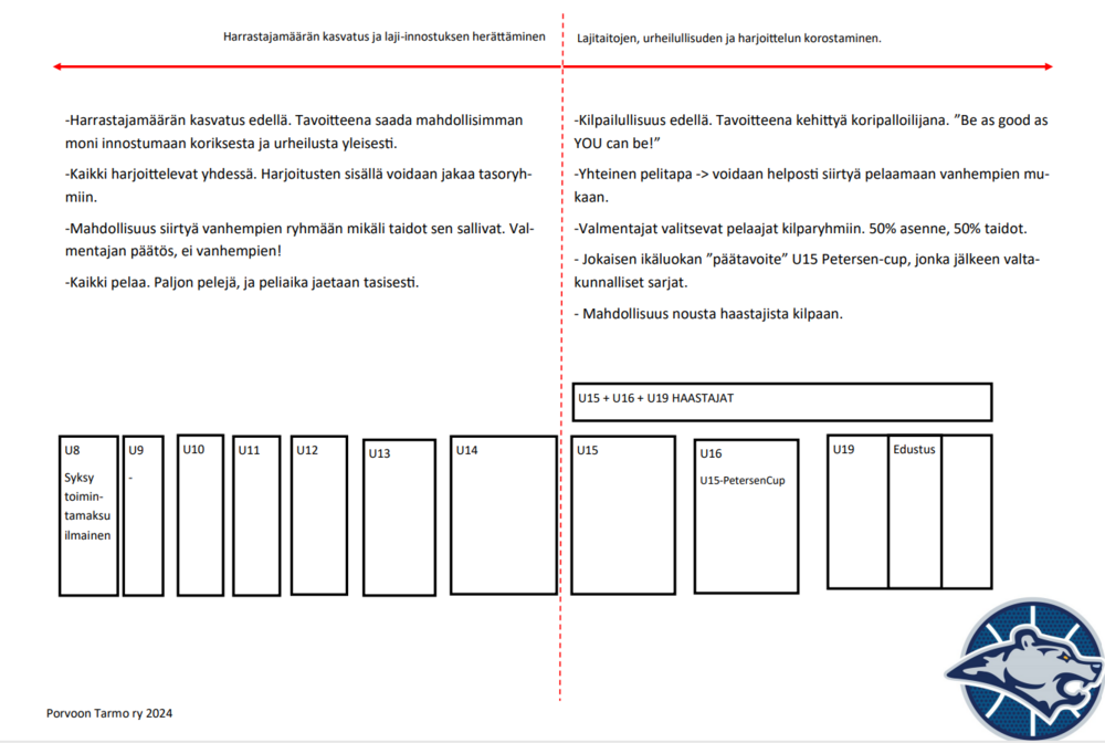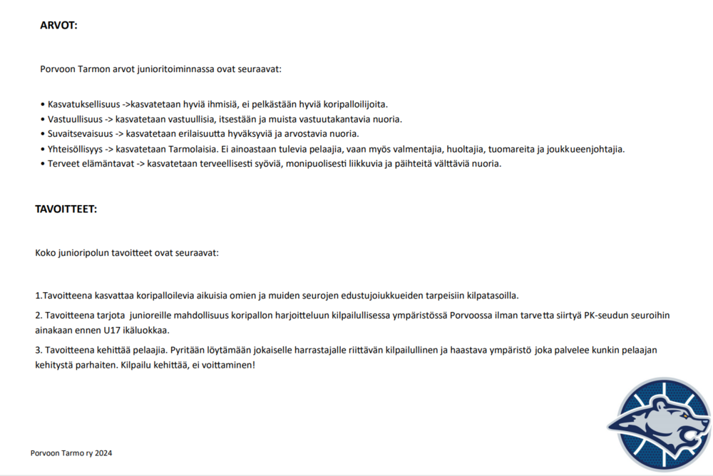2. Tavoitteena tarjota junioreille mahdollisuus koripallon harjoitteluun kilpailullisessa ympäristössä Porvoossa ilman tarvetta siirtyä PK-seudun seuroihin ainakaan ennen U17 ikäluokkaa.