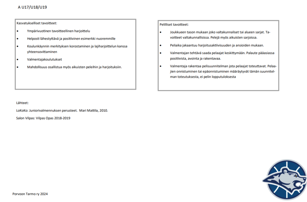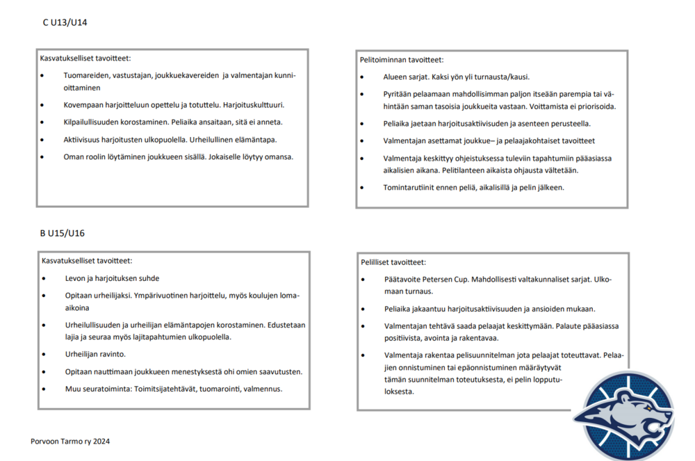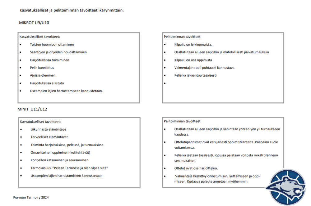 • Yhteisöllisyys -> kasvatetaan Tarmolaisia. Ei ainoastaan tulevia pelaajia, vaan myös valmentajia, huoltajia, tuomareita ja joukkueenjohtajia.